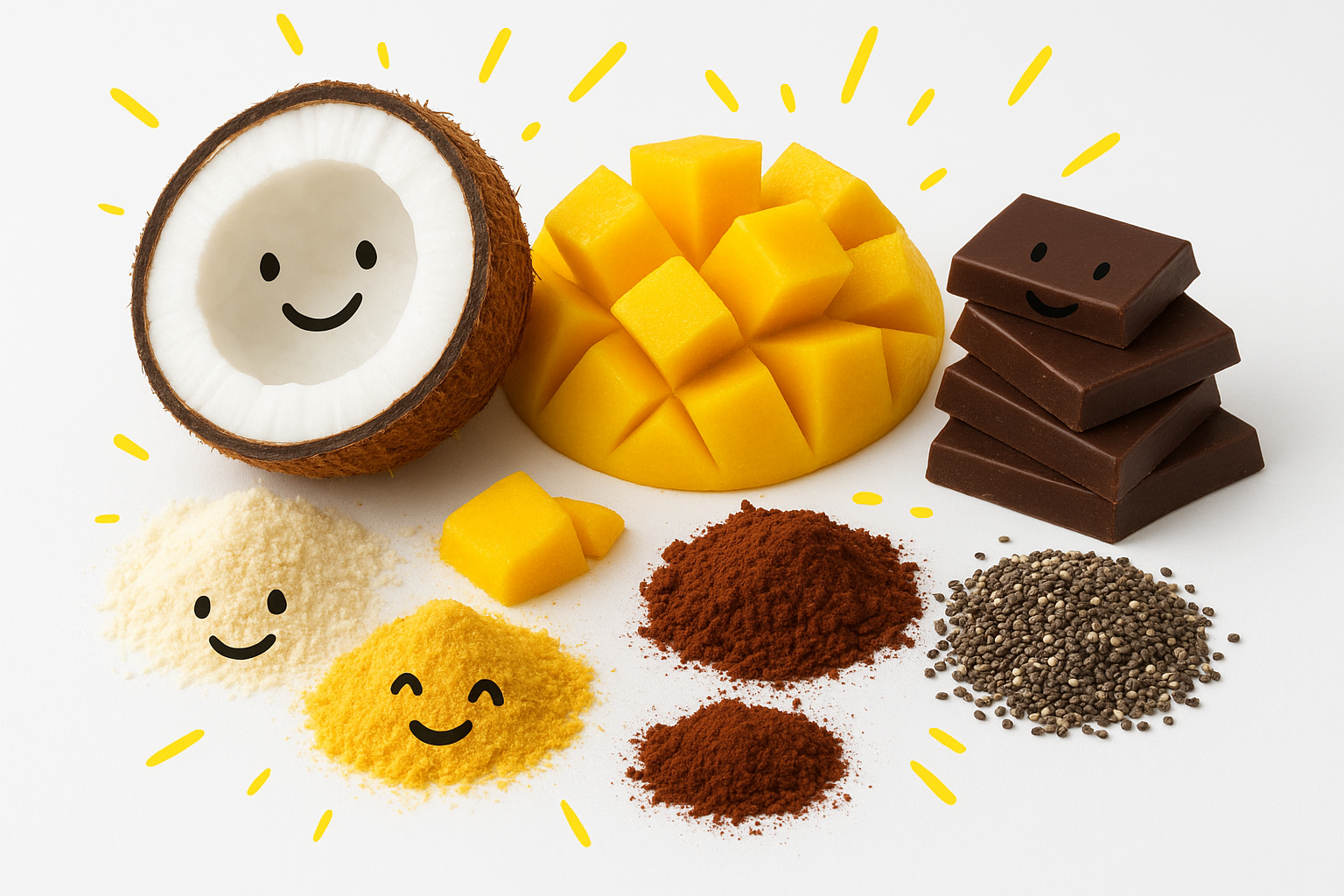Flavours. Depending on the flavour of Chipper, we use real cacao, genuine mango powder, organic raw sugar, or organic monkfruit sweetener.